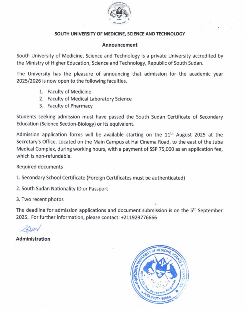 South University of Medicine, Science and Technology (SUMST), a private institution accredited by the Ministry of Higher Education, Science and Technology of the Republic of South Sudan, is pleased to announce that admissions for the 2025/2026 academic year are now open.